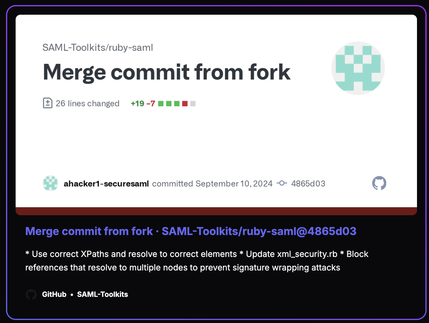 Ruby-SAML 库中提交了一个补丁(请参阅此处),试图加强安全性。以前,在 XPath 选择器中使用//访问元素的方式过于宽松。